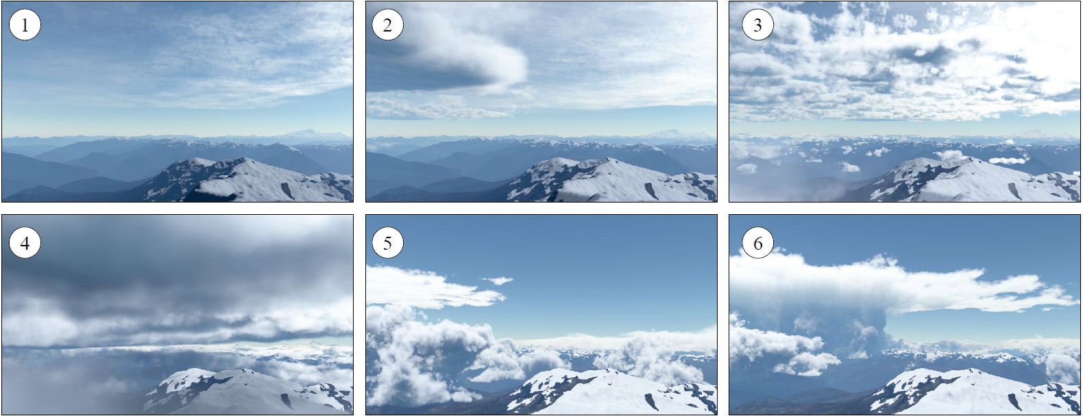 Antoine WEBANCK, Yann CORTIAL, Eric GUÉRIN and Eric GALIN. “Procedural cloudscapes”. In : Computer Graphics Forum. T. 37. 2. Wiley Online Library. 2018, p. 431-442