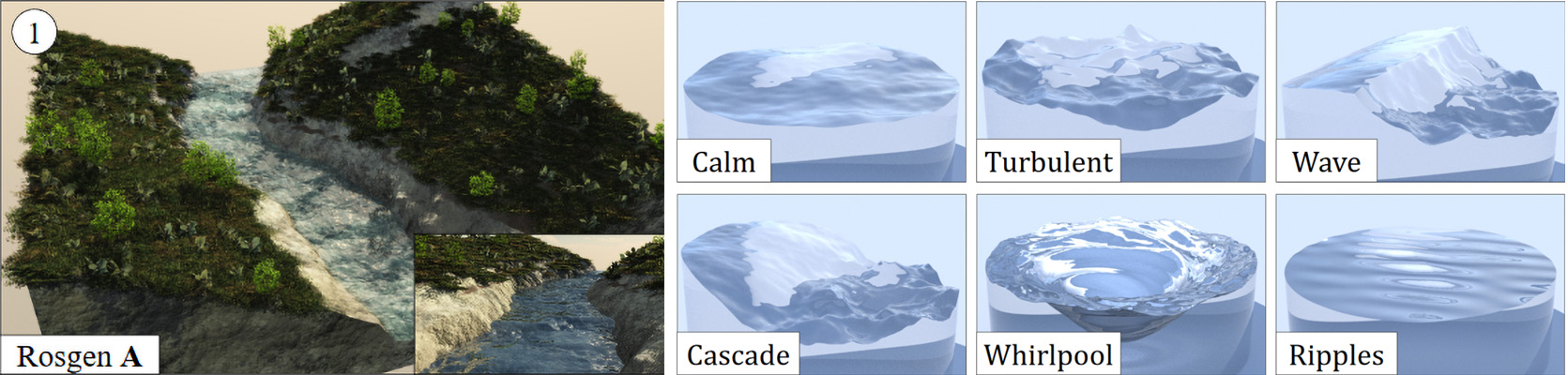 Abstract: This paper addresses the problem of creating animated riverscapes through a novel procedural framework that generates the inscribing geometry of a river network and then synthesizes matching real-time water movement animation. Our approach takes bare-earth heightfields as input, derives hydrologically-inspired river network trajectories, carves riverbeds into the terrain, and then automatically generates a corresponding blend-flow tree for the water surface. Characteristics, such as the riverbed width, depth and shape, as well as elevation and flow of the fluid surface, are procedurally derived from the terrain and river type. The riverbed is inscribed by combining compactly supported elevation modifiers over the river course. Subsequently, the water surface is defined as a time-varying continuous function encoded as a blend-flow tree with leaves that are parameterized procedural flow primitives and internal nodes that are blend operators. While river generation is fully automated, we also incorporate intuitive interactive editing of both river trajectories and individual riverbed and flow primitives. The resulting framework enables the generation of a wide range of river forms, ranging from slow meandering rivers to rapids with churning water, including surface effects, such as foam and leaves carried downstream.
