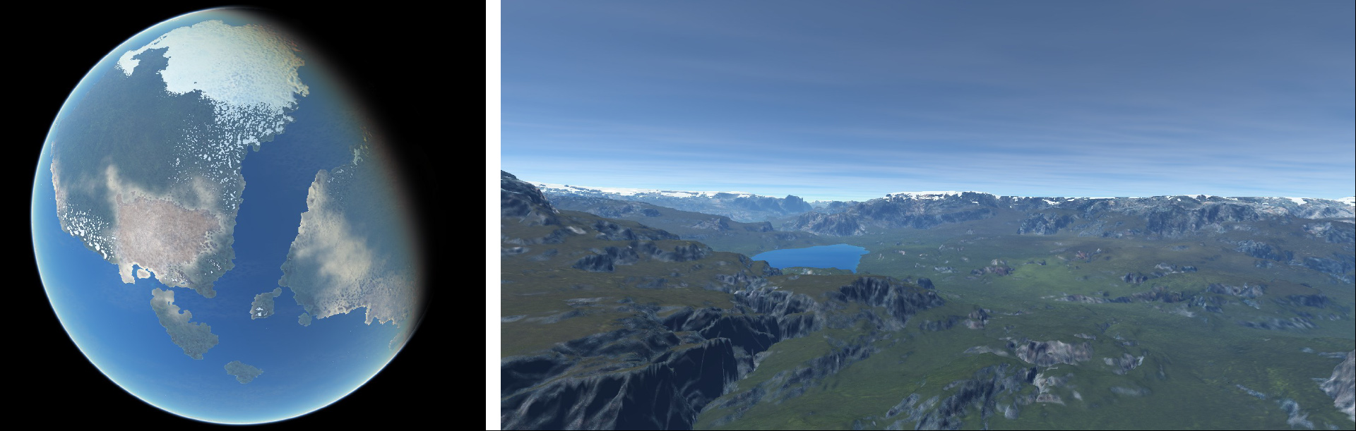 Abstract: Allowing the real-time exploration of huge, detailed, heterogeneous synthetic terrains remains an unsolved challenge in computer graphics, despite forty years of research. In general, existing methods only handle terrains of limited extent, defined over a planar topology. In this thesis, we explore terrain modeling at maximum-scale, i.e. at planetary scale - a scale which exceeds by four orders of magnitude the extent of the domain of classical terrain synthesis. However, this problem has been largely neglected, only a couple of modeling methods have been proposed in past research. To tackle this challenge, we propose a novel decoupled solution, capable of generating true-to-scale planets. Our architecture takes first into account the geology of terrestrial planets by deploying a guided plate tectonics simulation. This simulation allows the generation of large-scale planetary features such as continents, oceanic relief, islands arcs and mountain ranges. This macroscopic model is then forwarded as an input to an hyper-amplification method capable of producing continuous, detailed real-time views of the terrain. To handle the size of the domain, the procedural amplification method relies on the pre-structuration of the tectonic model, allowing on-the-fly generation of the final detailed model, restricted to the current camera view. The model is produced entirely on the GPU by relying on a massively parallel stochastic subdivision scheme, guided by level-of-detail dependent rules. Overall, our method better handles certain problems tied to previous fractal methods, such as the self-similarity of homogeneous landscapes and the lack of user-control, by producing planets that show more variety, appear more realistic and can be more efficiently designed by artists.